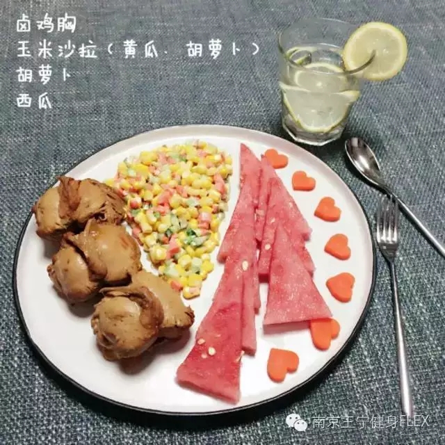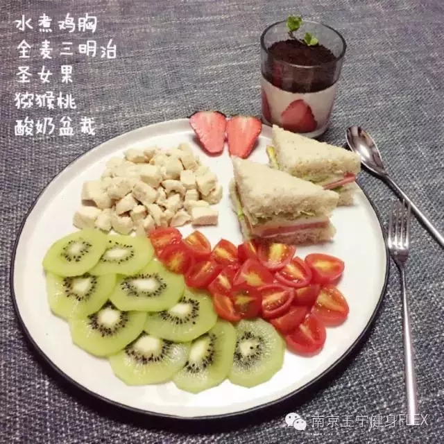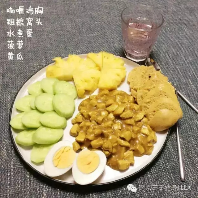 粗粮窝头1个(买现成的)、鸡胸150g、菠萝100g、黄瓜半根、鸡蛋一枚; 训练之后,吃上这样一顿美味又健康的饭食,重要的是专业指导下的减脂餐只增肌不增脂哦。 专业的技术训练指导和科学、合理的健身餐搭配,想不拥有健康、曲线身材都不行呀!